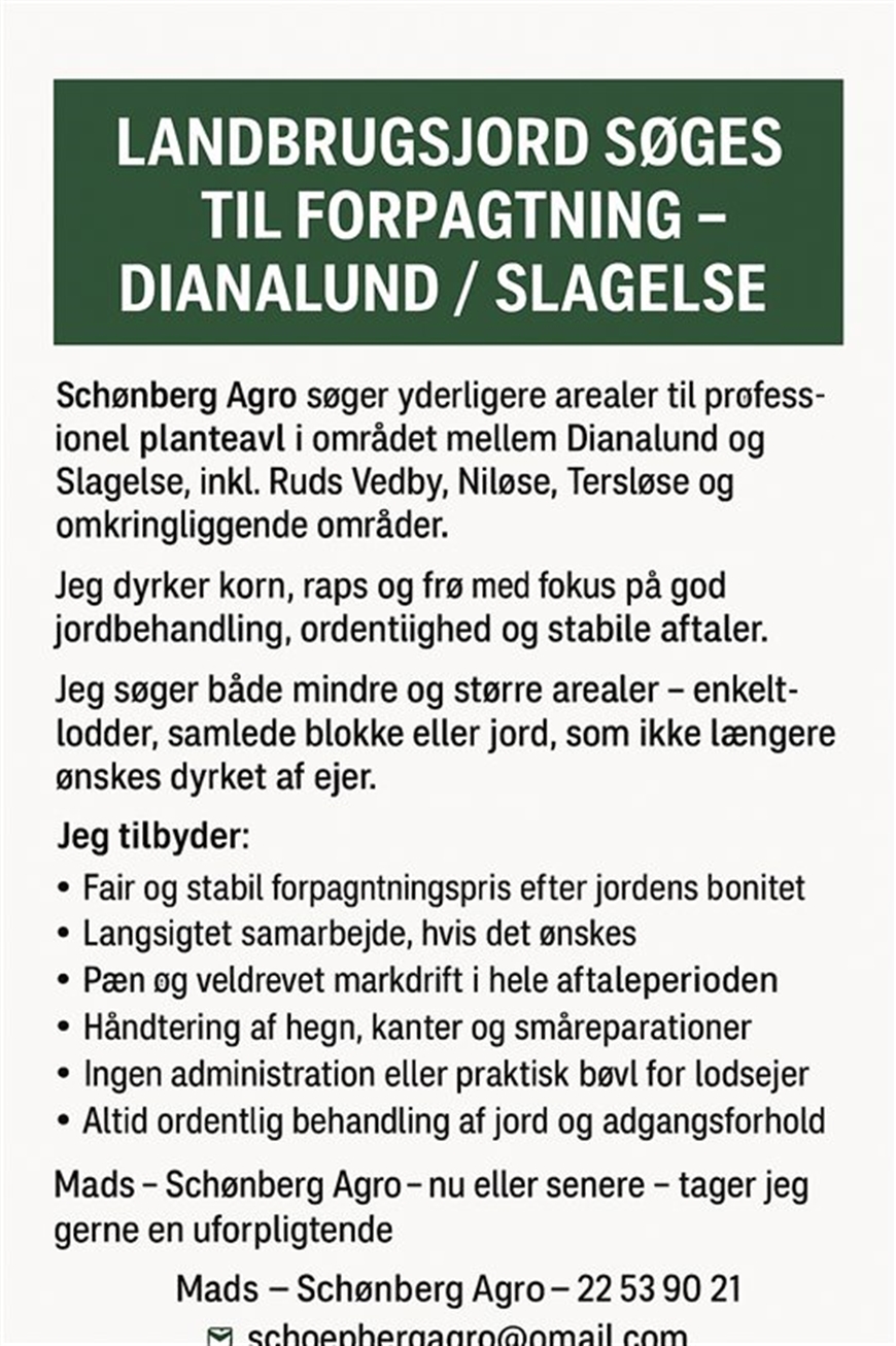 Schønberg Agro søger yderligere arealer til professionel planteavl i området mellem Dianalund og Slagelse, inkl. Ruds Vedby, Niløse, Tersløse og omkringliggende områder.